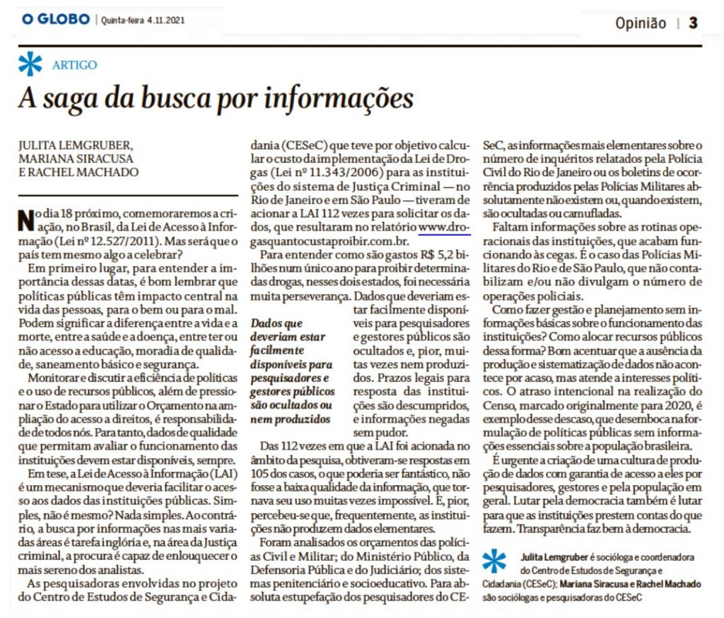 Veículo O Globo Data 04/11/2021 AUTORASJulita Lemgruber, Mariana Siracusa, Rachel Machado versao para impressão Drogas Justiça Segurança Pública