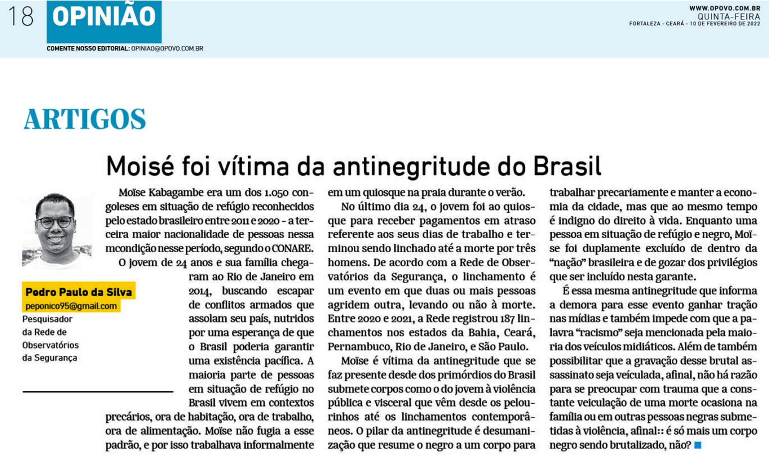 Veículo O Povo Data 10/02/2022 AUTORPedro Paulo da Silva Leia o artigo: Imagem PDF versao para impressão Racismo Violência