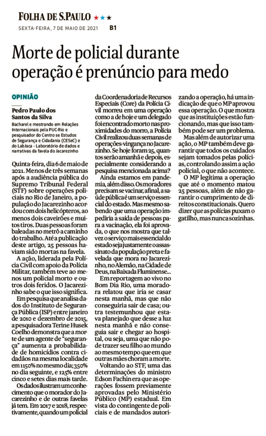 Os dados ilustram um conhecimento que o morador do Jacarezinho e de outras favelas já tem. Em 2017 e 2018, respectivamente, quando um policial da Coordenadoria de Recursos Especiais (CORE) da Polícia Civil morreu em outra operação como a de hoje e um delegado foi encontrado morto nas proximidades do morro, a Polícia Civil realizou duas semanas de operaçõesvingança na favela do Jacarezinho. Se hoje foram 25, quantos serão amanhã e depois, especialmente considerando a pesquisa mencionada acima?