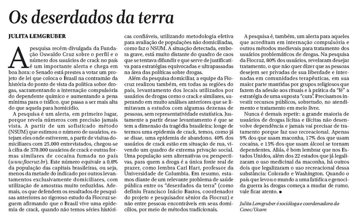 Além da pesquisa domiciliar, a equipe da Fiocruz realizou também, em todas as regiões do país, levantamento dos locais utilizados por usuários de drogas como o crack e similares, superando em muito análises anteriores que se limitavam a estudos com algumas dezenas de pessoas, sem representatividade estatística. Justamente a partir desse levantamento é que se tem a dimensão da tragédia brasileira: longe de termos uma epidemia de crack, temos, como já se disse, uma epidemia de abandono. 40% dos usuários de crack estão em situação de rua, vivendo um quadro de extrema privação social. Uma população sem alternativas ou perspectivas, para quem a droga é a única fonte real de prazer, como lembra Carl Hart, professor da Universidade de Columbia. Em resumo, estamos diante de um relevante problema de saúde pública entre os “deserdados da terra” (como definiu Francisco Inácio Bastos, coordenador do projeto e pesquisador sênior da Fiocruz) e não entre pessoas encontráveis em seus domicílios, por meio de métodos tradicionais.