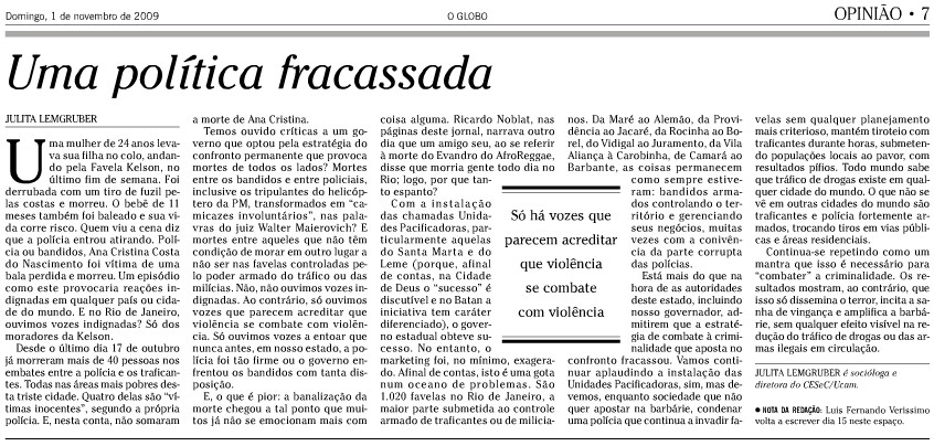 Está mais do que na hora de as autoridades deste estado, incluindo nosso governador, admitirem que a estratégia de combate à criminalidade que aposta no confronto fracassou. Vamos continuar aplaudindo a instalação das Unidades Pacificadoras, sim, mas devemos, enquanto sociedade que não quer apostar na barbárie, condenar uma polícia que continua a invadir favelas sem qualquer planejamento mais criterioso, mantém tiroteio com traficantes durante horas, submetendo populações locais ao pavor, com resultados pífios. Todo mundo sabe que tráfico de drogas existe em qualquer cidade do mundo. O que não se vê em outras cidades do mundo são traficantes e polícia fortemente armados, trocando tiros em vias públicas e áreas residenciais.