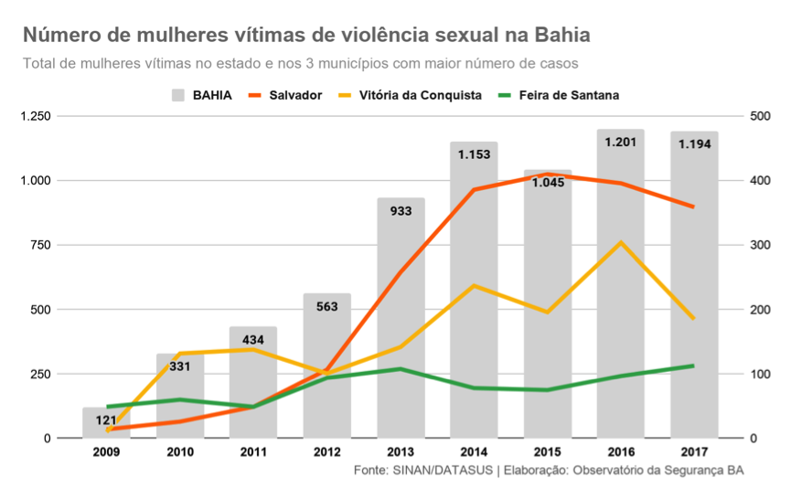 As mulheres negras também sofrem com a violência sexual mais do que as brancas, mostrou o mesmo estudo. De 2009 a 2017, 6.975 mulheres foram vítimas de violência sexual na Bahia, com aumentos sucessivos de ano a ano: em 2009, foram registrados 121 casos; oito anos depois, em 2017 (últimos dados disponíveis), o número de ocorrências foi de 1.194, um aumento de 887%.
