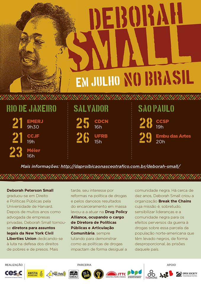 Deborah Peterson Small criou a organização Break the Chains cuja missão é, sobretudo, sensibilizar lideranças e a comunidade negra para os efeitos perversos da guerra à drogas sobre essa parcela da população norte-americana que têm levado negros, de forma desproporcional, às prisões daquele país.