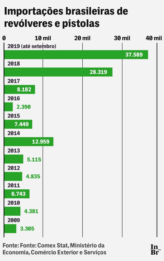 O aumento começou já em 2018 – ano da campanha eleitoral inflamada pelo discurso pró-armas. Neste ano, porém, com o decreto que flexibiliza a posse e a fissura no monopólio da Taurus, denunciada pelo Ministério Público por venda de armas com defeito, o número explodiu. Um relatório obtido pelo Intercept, feito com base em dados de importação de armamentos do Ministério da Economia, Comércio Exterior e Serviços, mostrou que o número de armas importadas aumentou 1.473% este ano em comparação com 2016. Naquele ano, 2.390 armas foram importadas. Só em 2019 o número subiu para 37.589.