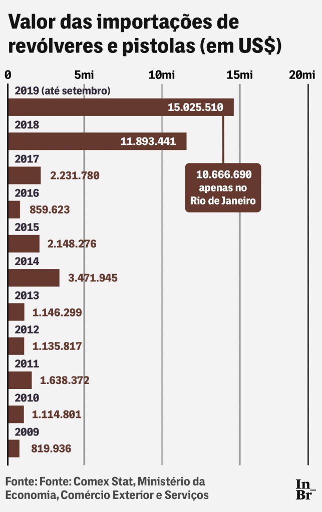 Esse mercado de importação de armas movimentou, entre janeiro e setembro, mais de 15 milhões de dólares – aproximadamente R$ 60 milhões. A maior parte desse valor – R$ 44 milhões – foi movimentada por empresas do Rio de Janeiro, estado diariamente nos holofotes pela atuação nefasta de milícias.