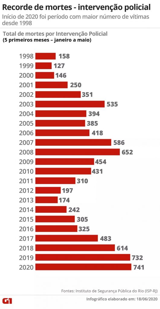 O estado registrou 741 vítimas nos cinco primeiros meses de 2020, o que equivale a quase cinco pessoas mortas diariamente no RJ por agentes do estado.