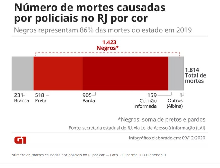 O RJ teve 1,8 mil vítimas que morreram durante a intervenção de forças policiais no último ano. Deste total, 1,4 mil eram negros, soma de pessoas pretas e pardas. Além disso, 159 não tiveram cor determinada. Os dados do estudo foram obtidos através da Lei de Acesso a Informação (LAI).