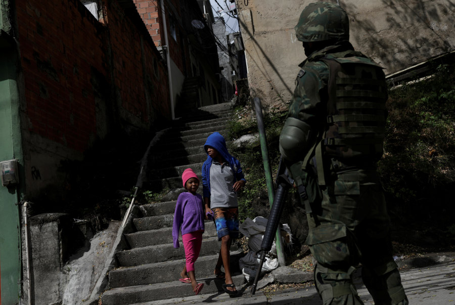 Residents walk as Armed Forces members patrol during an operation against the organized crime in Lins slum complex in Rio de Janeiro, Brazil August 5, 2017. REUTERS/Ricardo Moraes