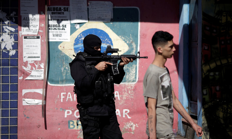 A policeman takes up position during an operation against drug dealers in Cidade de Deus slum in Rio de Janeiro, Brazil, July 10, 2017. REUTERS/Ricardo Moraes