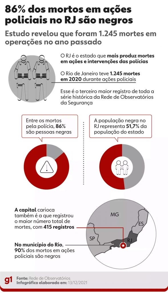 Com 1.245 óbitos, o Rio de Janeiro foi o estado que mais produziu mortes durante ações policiais no ano de 2020, entre os sete estados brasileiros analisados pela Rede de Observatórios da Segurança. Desse total, 86% das mortes foram de pessoas negras.