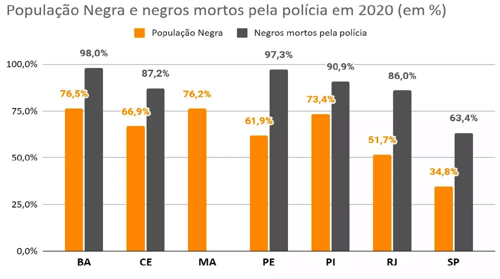 De acordo com a pesquisa, a cada quatro horas, uma pessoa negra é morta em ações policiais em seis dos sete estados monitorados pela Rede: Bahia, Ceará, Piauí, Pernambuco, Rio de Janeiro e São Paulo. O governo do Maranhão não informa a cor das vítimas da violência, o que para os pesquisadores é mais uma forma de racismo institucional.