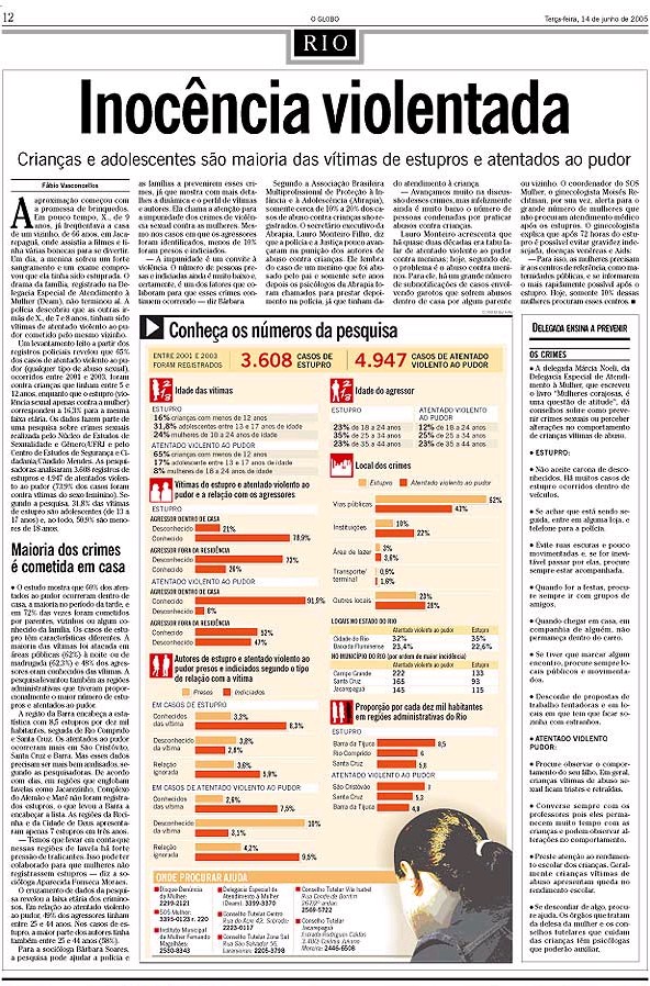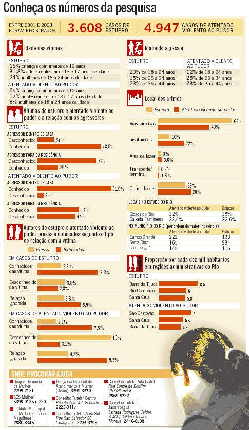Um levantamento feito a partir dos registros policiais revelou que 65% dos casos de atentado violento ao pudor (qualquer tipo de abuso sexual), ocorridos entre 2001 e 2003, foram contra crianças que tinham entre 5 e 12 anos, enquanto que o estupro (violência sexual apenas contra a mulher) correspondeu a 16,3% para a mesma faixa etária. Os dados fazem parte de uma pesquisa sobre crimes sexuais realizada pelo Núcleo de Estudos de Sexualidade e Gênero/UFRJ e pelo Centro de Estudos de Segurança e Cidadania/Cândido Mendes. As pesquisadoras analisaram 3.608 registros de estupros e 4.947 de atentados violento ao pudor (73,9% dos casos foram contra vítimas do sexo feminino). Segundo a pesquisa, 31,8% das vítimas de estupro são adolescentes (de 13 a 17 anos) e, ao todo, 50,9% são menores de 18 anos.