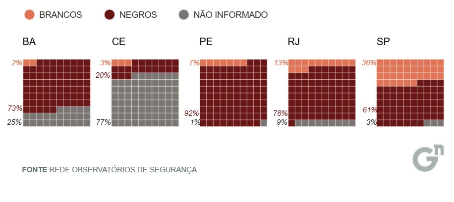 Ainda não há dados de raça para as vítimas de 2020, mas os mais recentes, de 2019, mostram que no Rio de Janeiro pessoas negras são 86% daquelas mortas pela polícia. Os dados são da Rede de Observatórios da Segurança e consideram os cinco estados monitorados pela rede. Na Bahia, a proporção de negros entre os mortos chega a 97%. No Ceará, 87%, e em Pernambuco, 93%. Em São Paulo, que tem menor proporção entre os estados monitorados, negros são 63% dos mortos.