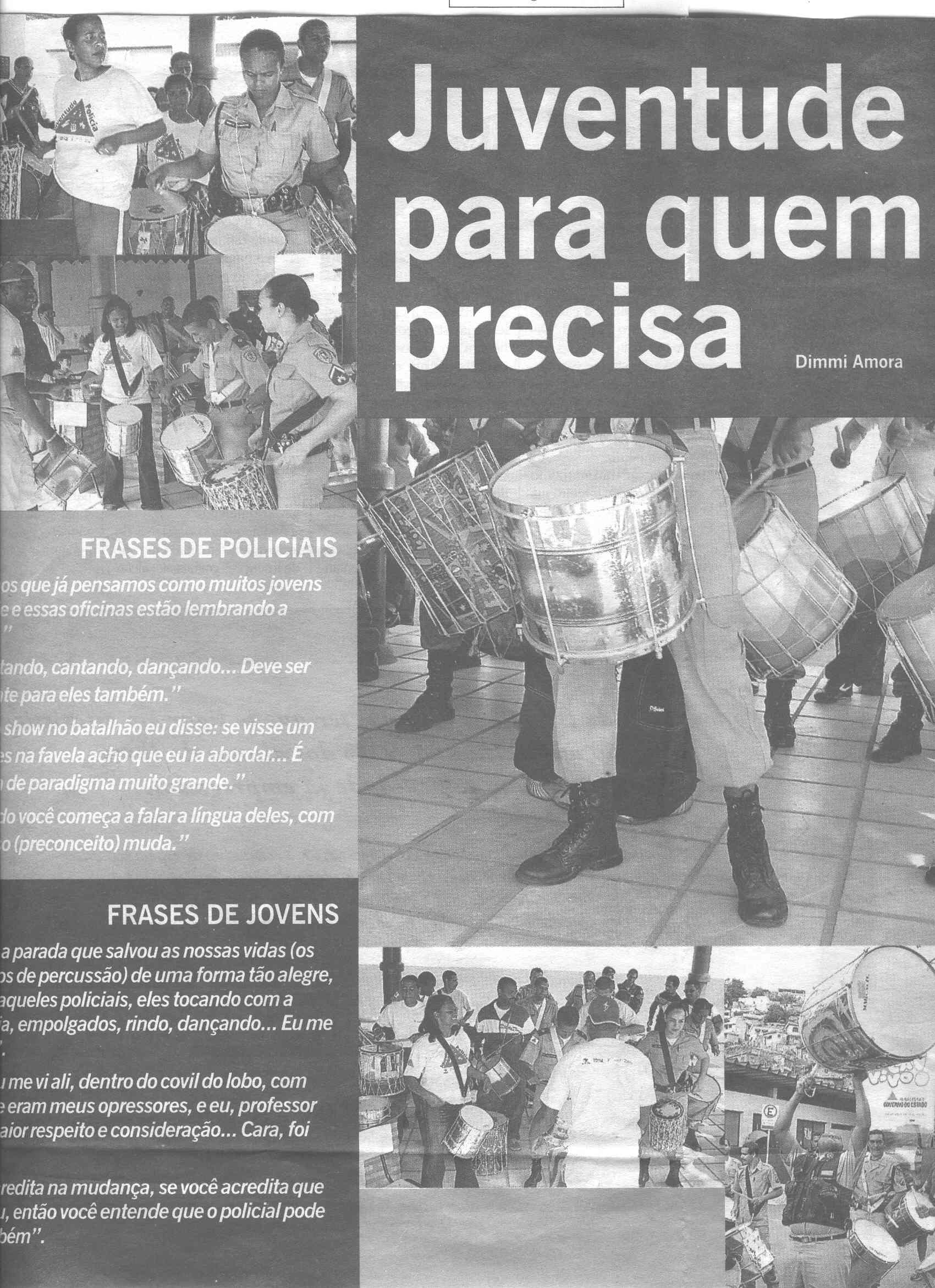 De um lado, policiais fardados com suas conhecidas caras de mau. De outro, jovens moradores de comunidades carentes com seus conhecidos olhares desconfiados. No meio, um problema nacional: o preconceito de um grupo contra o outro, que gera violência da qual os dois lados são as maiores vítimas. Para tentar mudar este quadro, o jeito foi juntar as duas partes para fazer teatro, vídeo, malabarismo e batucar. Desde agosto, o Grupo Cultural Afroreggae, do Rio, está levando jovens cariocas para dar aula a policiais militares de Belo Horizonte no projeto Juventude e Polícia.