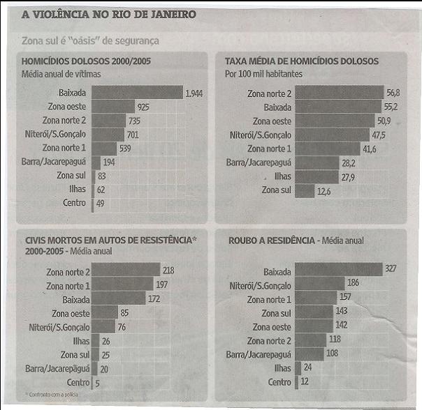Dados compilados pelo Centro de Estudos de Segurança e Cidadania (CESeC), da Universidade Candido Mendes, mostram que, entre 2000 e 2005, o local com mais assassinatos proporcionalmente no Estado foi Itaguaí (Baixada Fluminense): 81 homicídios por 100 mil habitantes, seis vezes o indicador da zona sul — que abriga a orla que vai do Flamengo a São Conrado, incluindo bairros como Lagoa, Jardim Botânico, Humaitá e Laranjeiras.