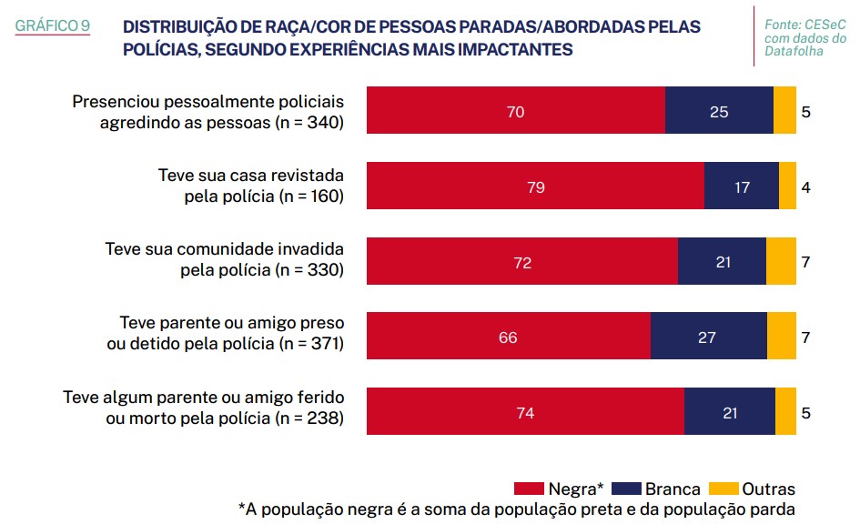 Entre os entrevistados, negros são 70% dos que presenciaram a polícia agredindo pessoas, 79% dos que tiveram suas casas invadidas e 74% dos que tiveram um parente ou amigo morto pela polícia.