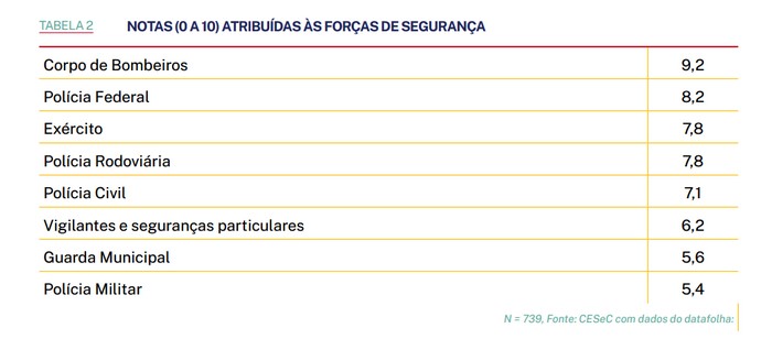 A pesquisa também perguntou aos entrevistados sobre a avaliação da PM em relação a eficiência, respeito, racismo, corrupção e violência. As pessoas também deram notas para as forças de segurança. A Polícia Militar teve o pior desempenho entre os participantes do estudo, com nota 5,4.