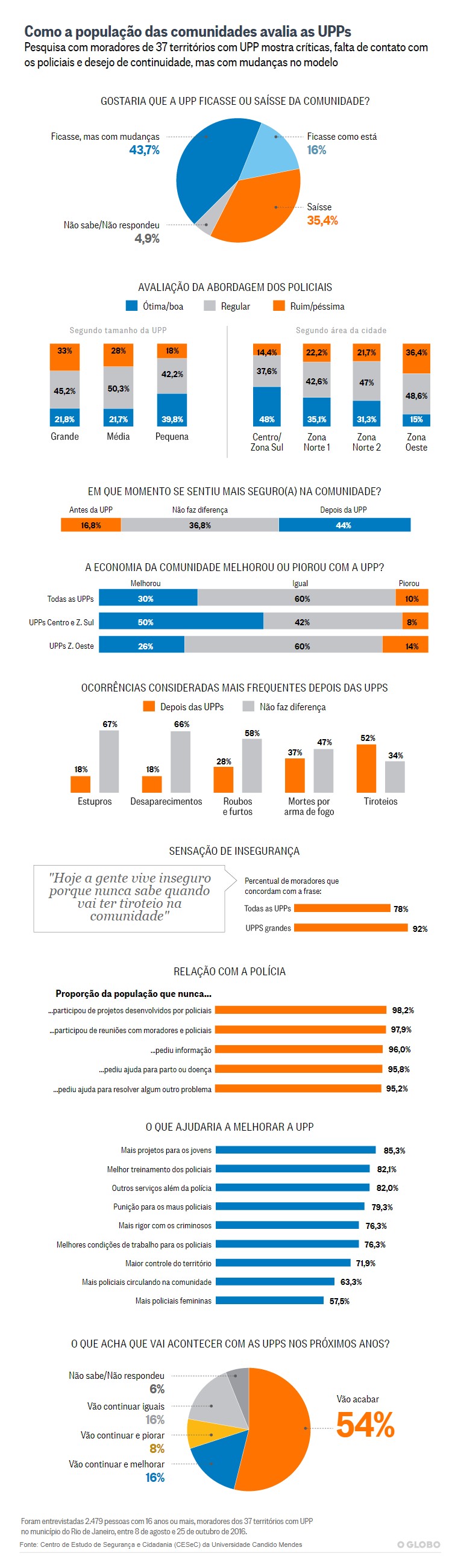 Uma pesquisa sobre os aspectos positivos e negativos das UPPs feita pelo Centro de Estudos de Segurança e Cidadania (CESec), da Universidade Cândido Mendes, com 2.479 pessoas que vivem em 37 das 38 regiões com Unidades de Polícia Pacificadoras no Rio (a Baixada Fluminense ficou de fora), mostra que a percepção dos impactos gerados pelo programa é baixa: a maioria dos entrevistados – numa variação percentual entre 55% e 68%, dependendo da comunidade e do perfil do morador (idade, escolaridade etc.) – afirmou que a presença da UPP “não faz diferença”. O levantamento com 56 perguntas, aplicadas nos domicílios dos entrevistados, foi realizado entre os dias 8 de agosto e 25 de outubro de 2016. Ou seja: incluiu os bons ventos dos Jogos Olímpicos, mas isso não foi suficiente para respaldar aspectos positivos de um projeto já em crise.