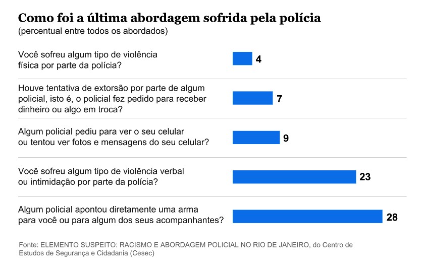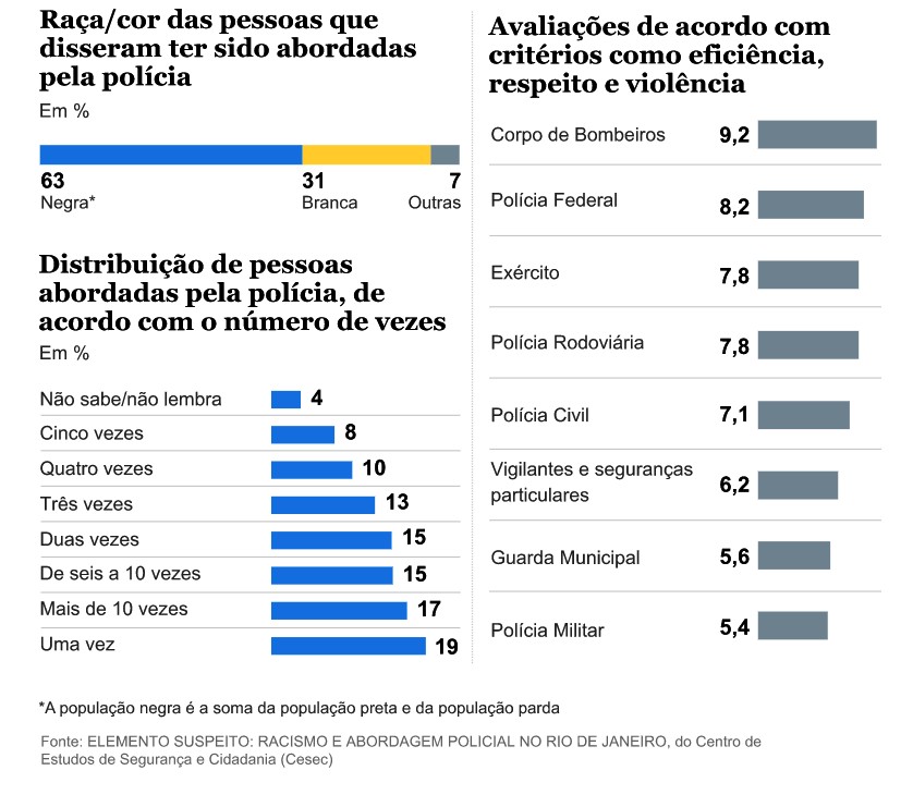 O resultado da pesquisa foi baseado em 3.500 entrevistas feitas pelo Instituto Datafolha em diferentes pontos da cidade do Rio, com moradores de mais de 16 anos, em maio de 2021. Depois, o estudo ouviu grupos específicos com jovens moradores de favelas e policiais. Além da abordagem policial, o trabalho perguntou aos entrevistados as notas que dariam às forças de segurança: a Polícia Militar teve a pior avaliação, com 5,4. Todos os resultados da pesquisa estão no boletim “Negro trauma: racismo e abordagem policial no Rio de Janeiro”.