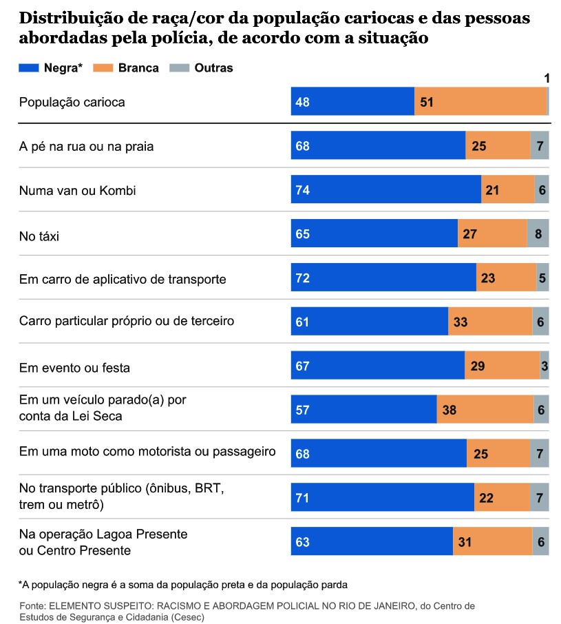 O estudo mostrou ainda que ações do cotidiano, quando exercidas por pessoas negras, são vistas como suspeitas. Negros são 68% dos que foram abordados andando na rua ou na praia, 74% em vans ou Kombis, 72% nos carros de aplicativos, 71% no transporte público, 68% em moto e 67% em um evento ou festa. Em todas as modalidades de abordagem citadas na pesquisa, os negros são mais parados do que os brancos.