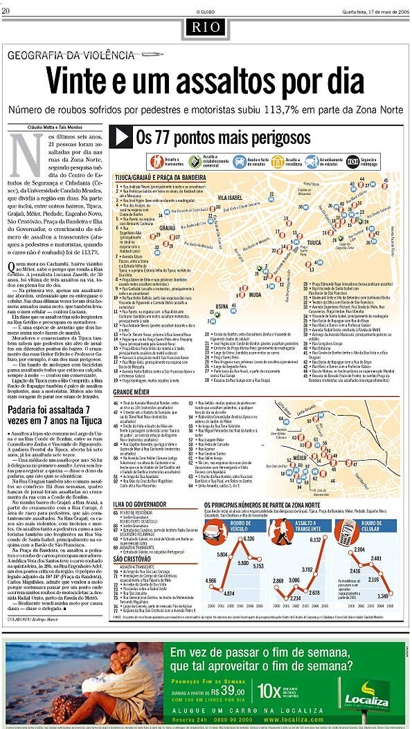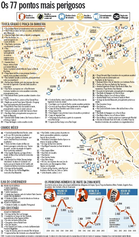 A pesquisa feita pelo Centro de Estudos de Segurança e Cidadania mostrou que, de 2000 a 2005, ocorreram na Zona Norte 97.099 roubos de veículos, o que representa uma média de 44 casos por dia. Nesse período, o crescimento foi de 47% na região.